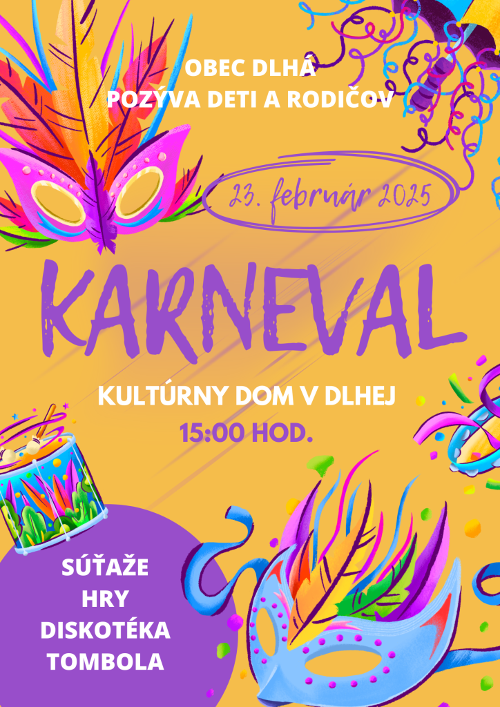 Obec Dlhá pozýva deti a rodičov na karneval, ktorý sa uskutoční dňa 23. februára o 15:00 hod. v Kultúrnom dome v Dlhej.